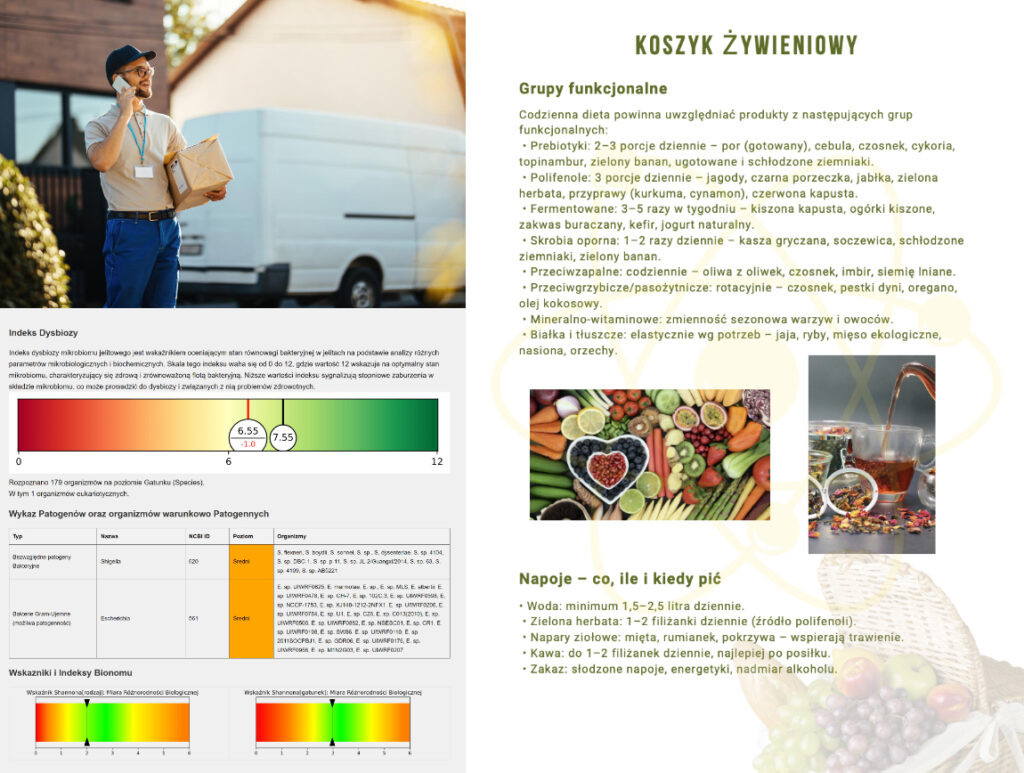 - Otrzymujesz pełny raport opisujący Twój stan jelit, zakres dysbiozy i jej konsekwencje zdrowotne + spersonalizowany plan probiotyczny.